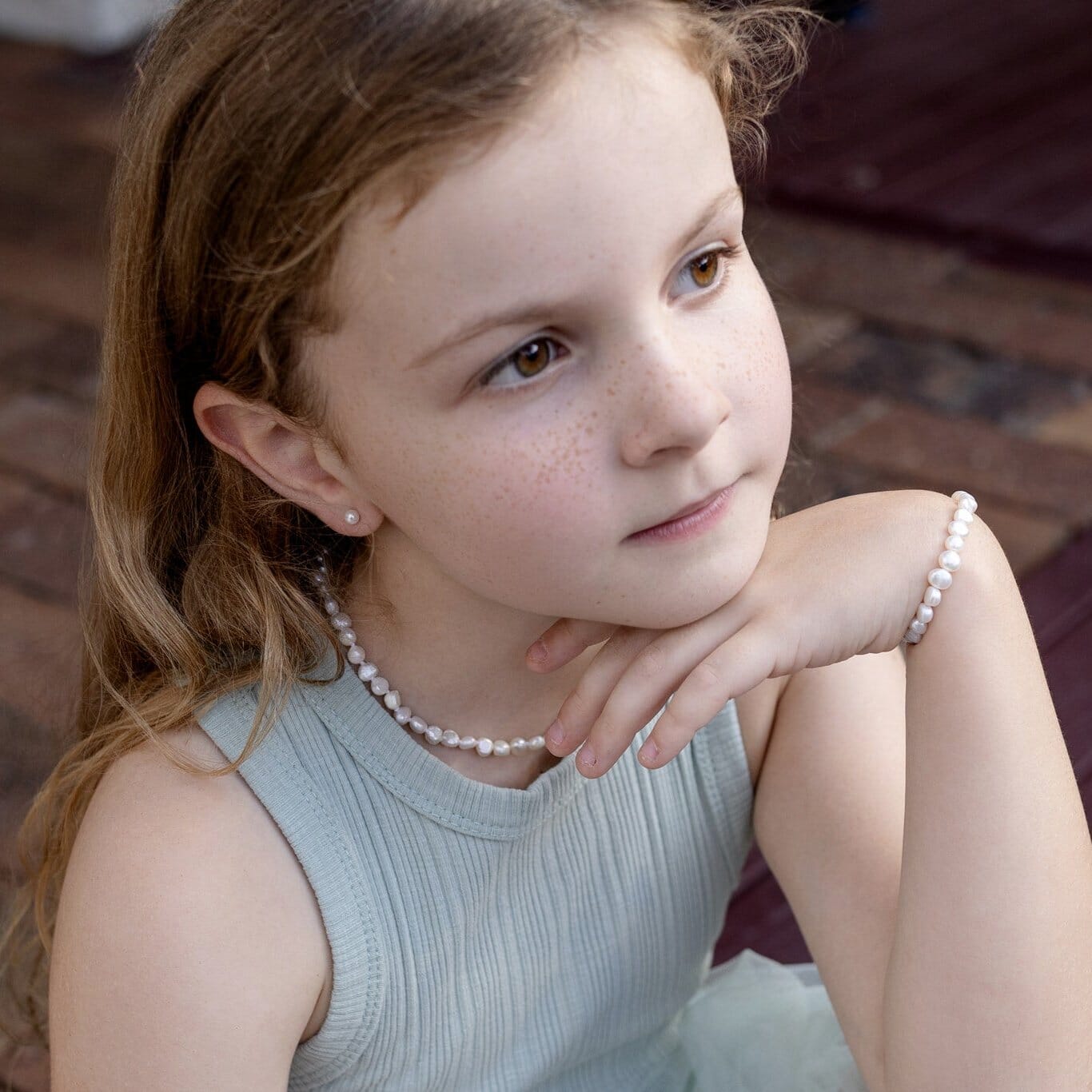 The Meadow Bracelet from our Bambini Collection is a delightful piece featuring unique Keshi pearls in natural white or soft pink. With its comfortable elastic design, this bracelet is easy to wear and perfect for any child. The natural, organic shapes of the pearls add a touch of playful elegance, making it a thoughtful gift or a charming addition to their collection for special occasions.