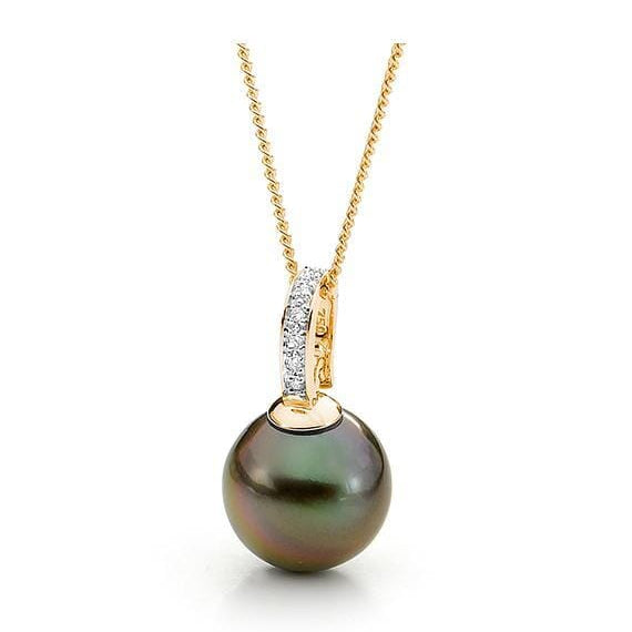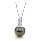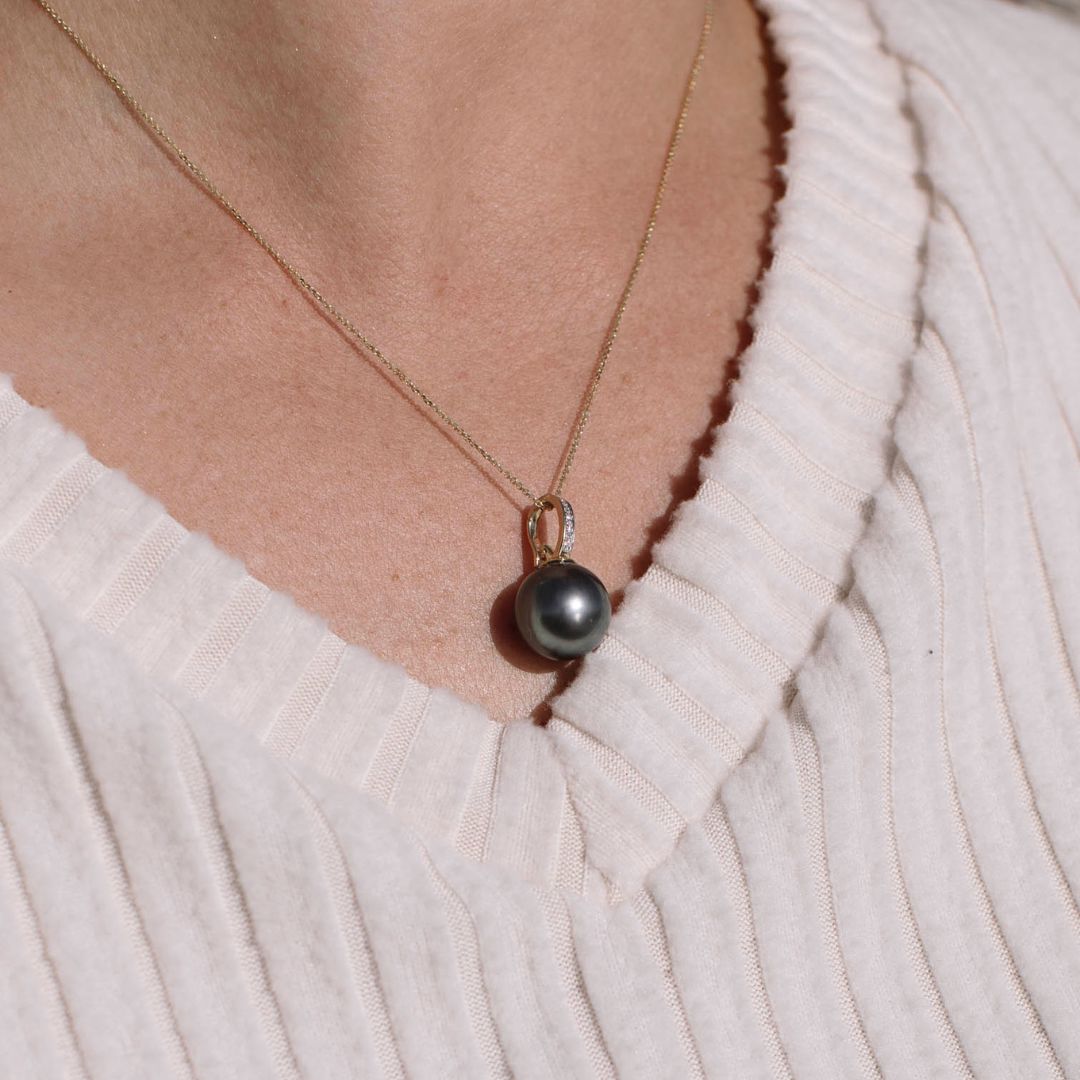 A perfect blend of vintage elegance and modern simplicity, the Sophia Tahitian Pendant showcases a luminous natural black Tahitian pearl, gracefully suspended from a diamond pavé-set bail. The rich hues and iridescent overtones of the pearl make each piece truly unique, while the delicate 9ct gold setting adds a touch of refined luxury. Designed as a versatile drop enhancer, this pendant pairs beautifully with your favourite chain.