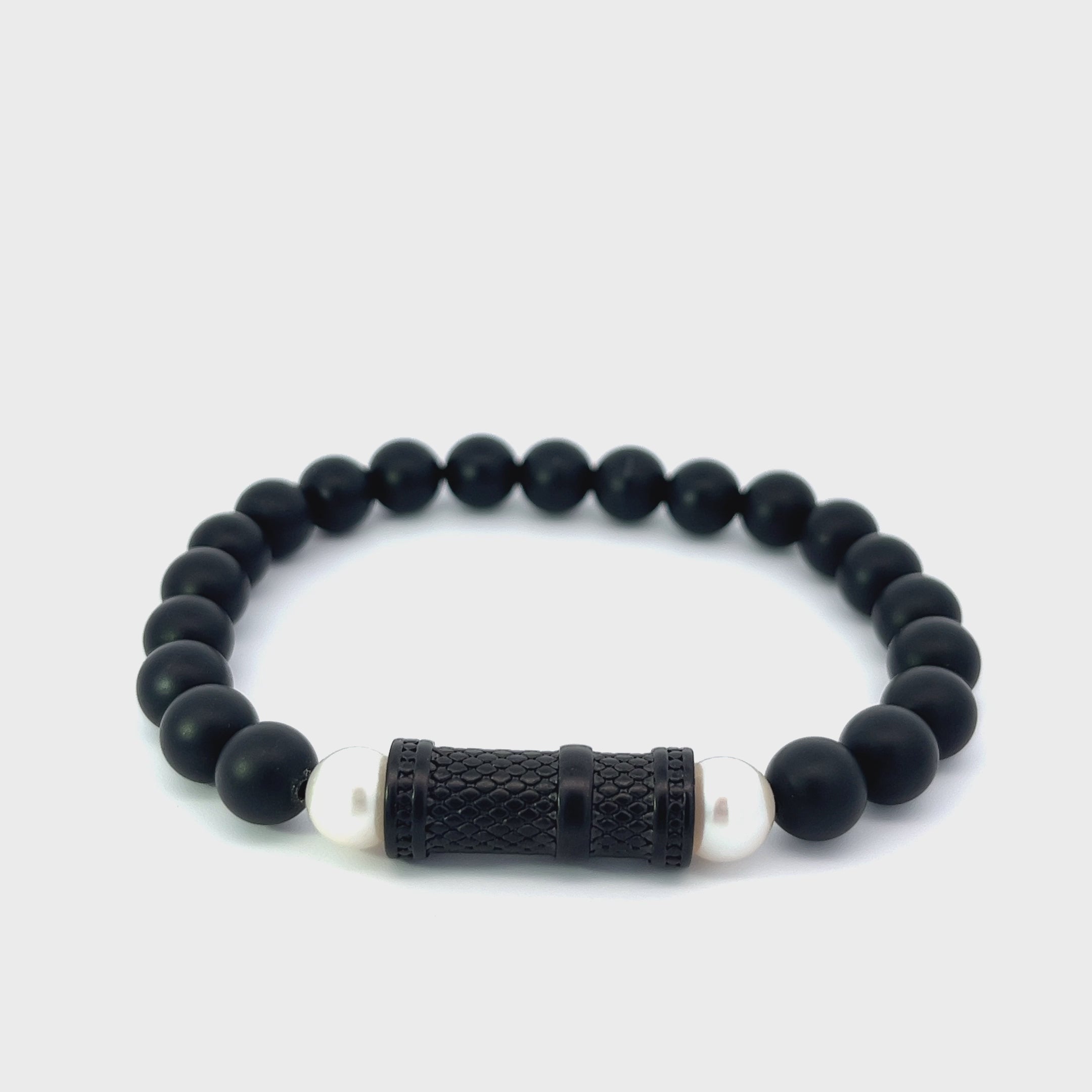 This men's bracelet features a striking combination of Agate beads complemented by an intricately ion-plated black lattice pattern stainless steel centrepiece, gracefully adorned with white freshwater pearls on either side, creating a harmonious blend of earthy and modern elements.