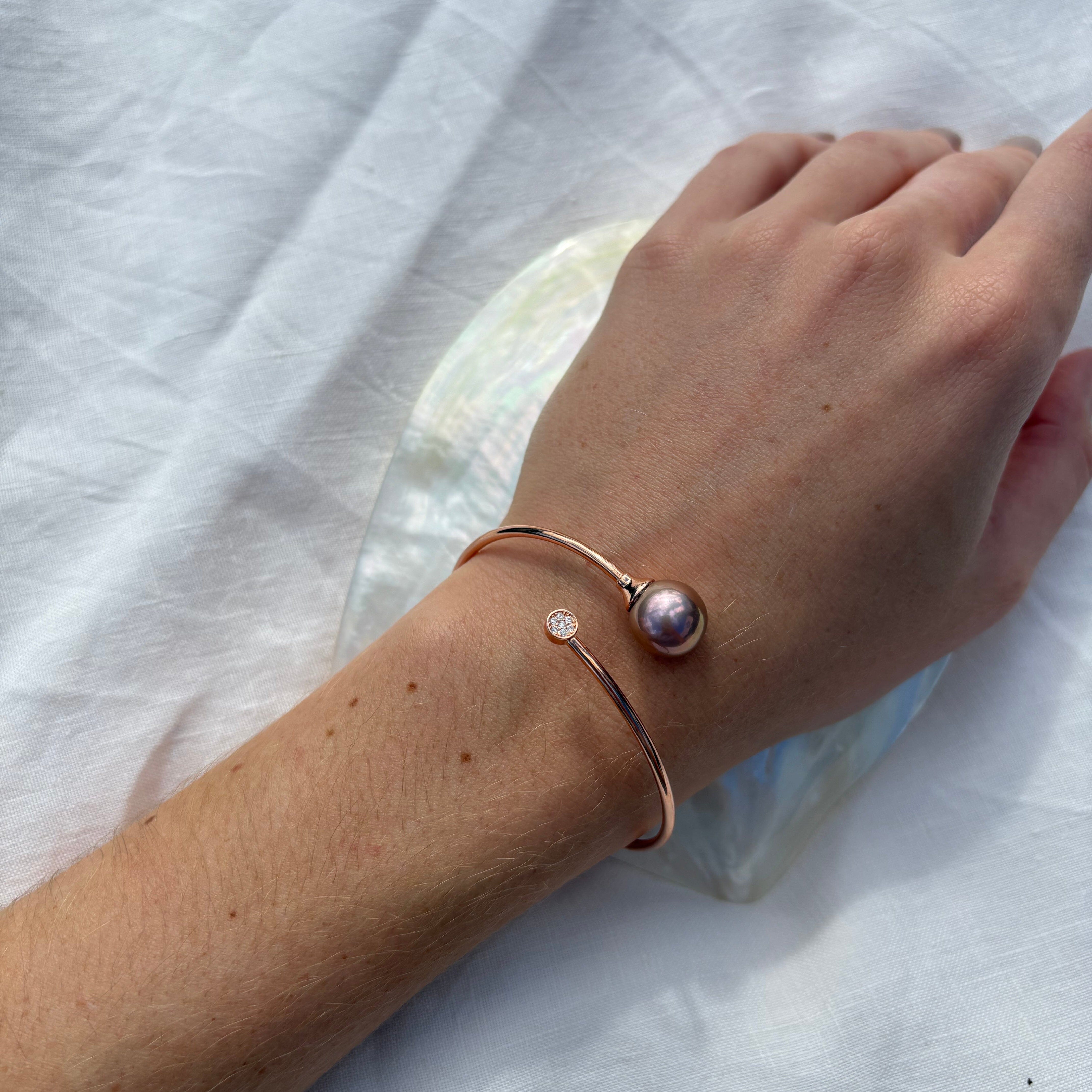 This fashionable and sleek bangle is one of our new favourites. Featuring a pink Edison Pearl it creates an every day option for a simple but elegant bangle.
