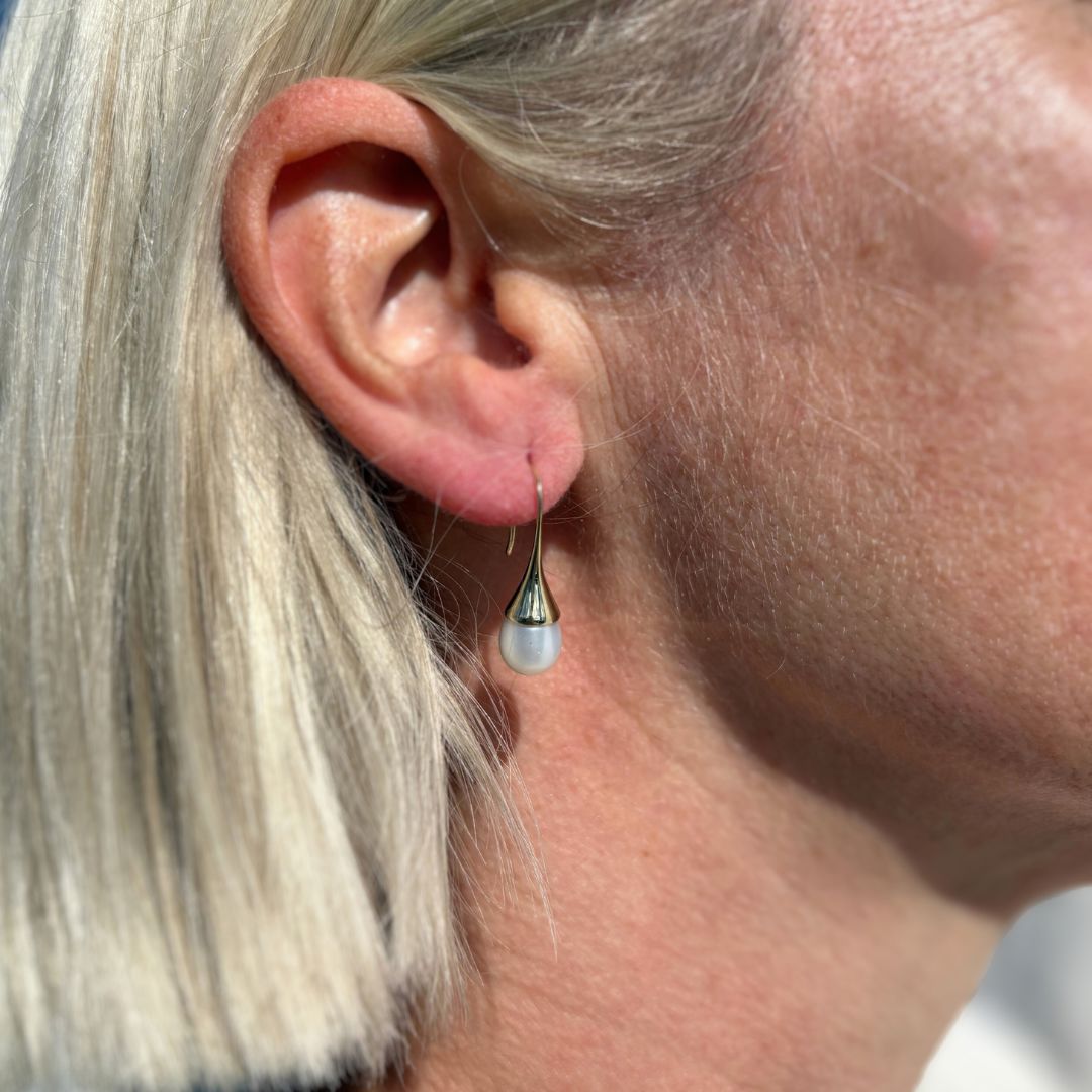 Stay effortlessly elegant with our Raindrop Earrings, featuring lustrous white freshwater pearls suspended from a sleek 9ct yellow gold cone hook design. Their lightweight feel and timeless style make them a go-to pair for any occasion. Whether for a bridal gift or a special celebration, these classic pearl drops are always a perfect choice.