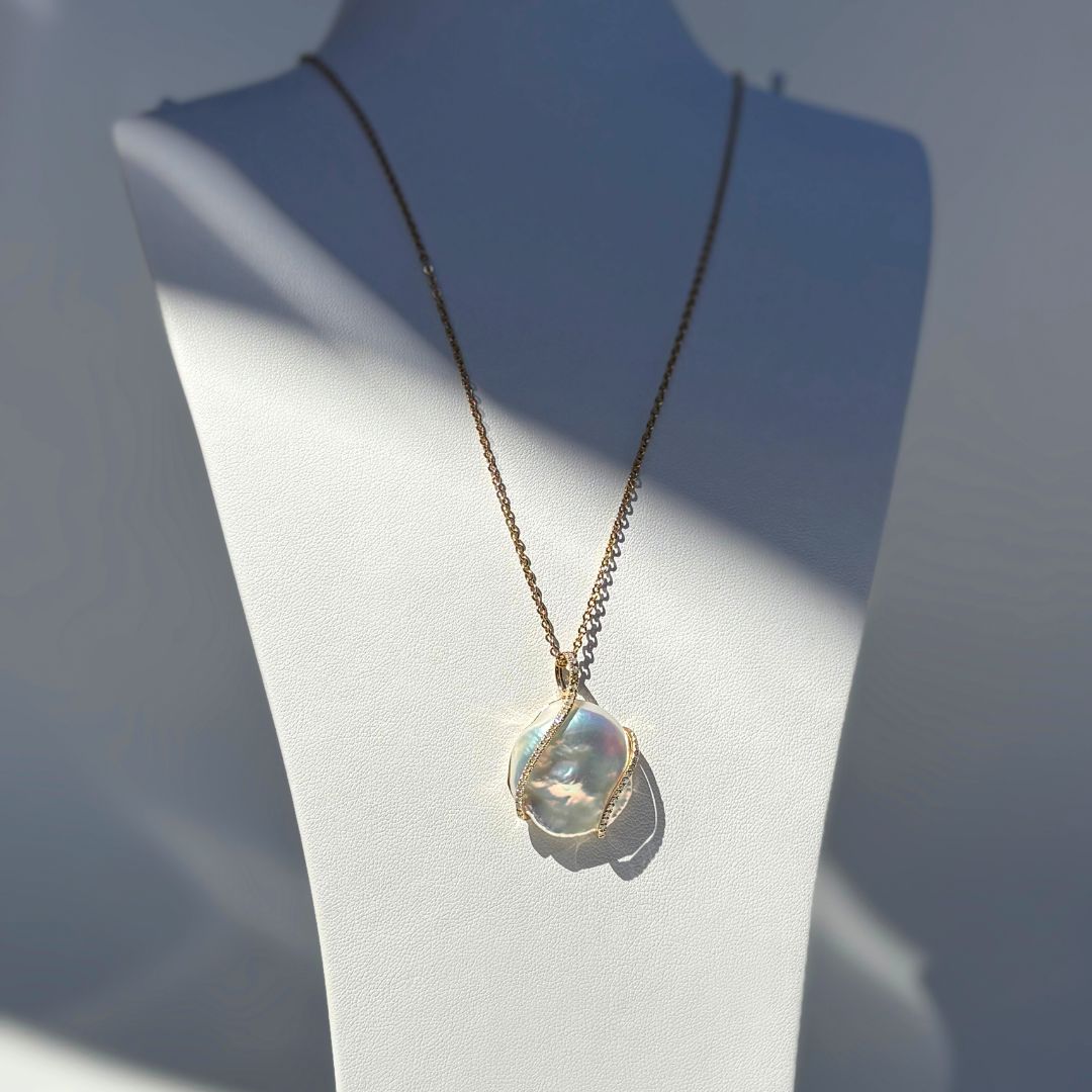 The Ruth Pendant showcases a striking white freshwater Keshi pearl, prized for its organic shape and luminous beauty. Set in 9ct yellow gold, the design is delicately accented with shimmering diamonds that wrap gracefully around the pearl, enhancing its natural elegance. Unique yet timeless, this refined pendant adds a sophisticated statement to both everyday wear and special occasions.