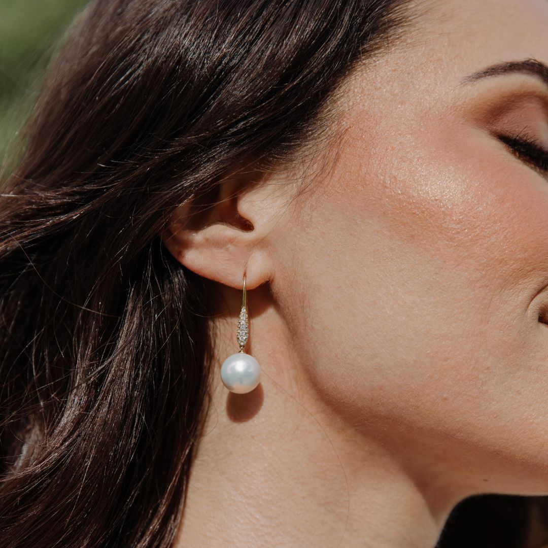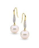 Experience refined elegance with our Aveline Edison Earrings, a spectacular combination of diamonds and Edison Freshwater pearls. These exquisite drop earrings feature lustrous pearls suspended from diamond-encrusted gold hooks, creating a captivating and elegant look.