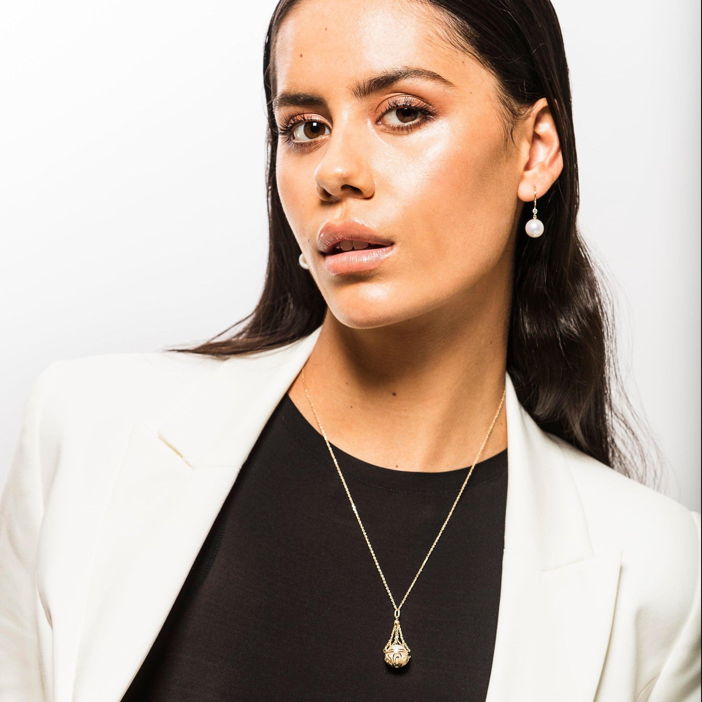 Intricately designed by Erica, this exquisite and refined pearl necklace features a diamond-encased basket. Set in 9ct Gold, it showcases your preference for either a white Round Edison or South Sea Pearl, with the option to switch to pearls of different colours. This stunning necklace offers versatility with three adjustable lengths of 50cm, 60cm, and 70cm, allowing you to wear it according to your preference.