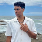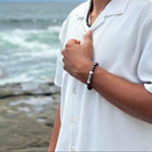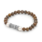 This men's bracelet features a striking combination of Bronzite beads complemented by an intricately ion-plated black lattice pattern stainless steel centrepiece, gracefully adorned with white freshwater pearls on either side, creating a harmonious blend of earthy and modern elements.