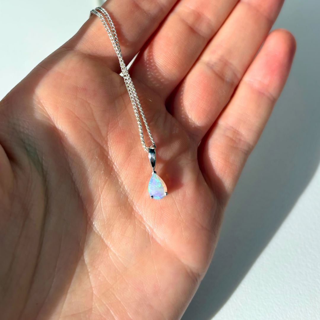 The Sparkling Rockpool Pendant celebrates the natural beauty of Australia, featuring a luminous solid light opal sourced from South Australia. Set in polished sterling silver, the gem shimmers with soft flashes of colour, reminiscent of sunlight dancing across a coastal rockpool. Effortlessly wearable, this pendant brings an organic elegance to summer styling while adding a relaxed, feminine bohemian touch to everyday looks.