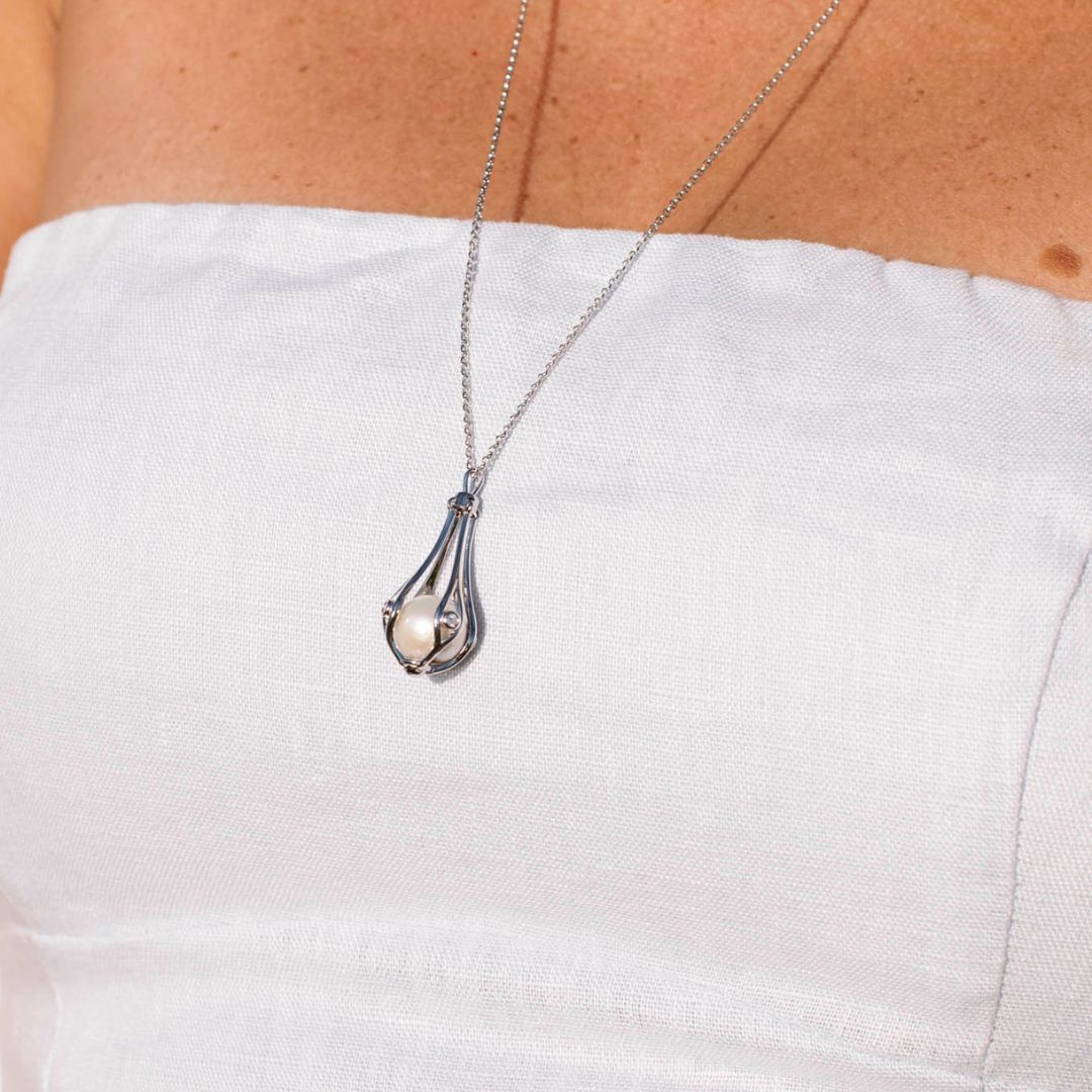 Classic with a modern twist, the Doris Necklace features a luminous 11.5–12mm round Edison pearl set in a sterling silver basket adorned with a delicate cubic zirconia. Designed with an adjustable chain (50, 60, or 70cm), it’s made to layer, style solo, or wear your way—every day or for something special.