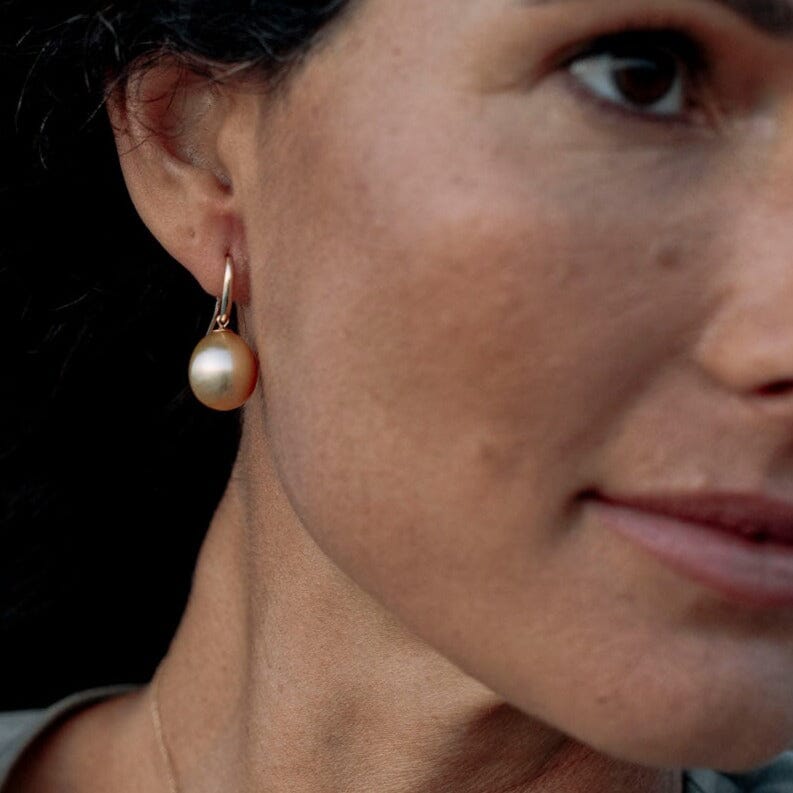 The Aurelia Earrings, adorned with natural Golden South Sea pearls, exemplifies the allure of one of the largest and most valuable pearls. Sourced from the gold-lip variety of the Pinctada Maxima South Sea pearl oyster, the warm, natural golden tones of this exquisite gem require no treatments, embodying the pure beauty of these luxurious pearls.