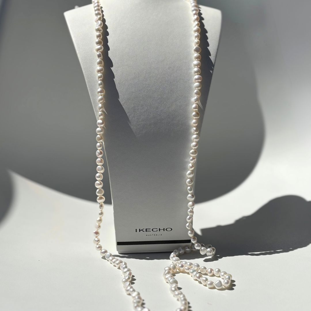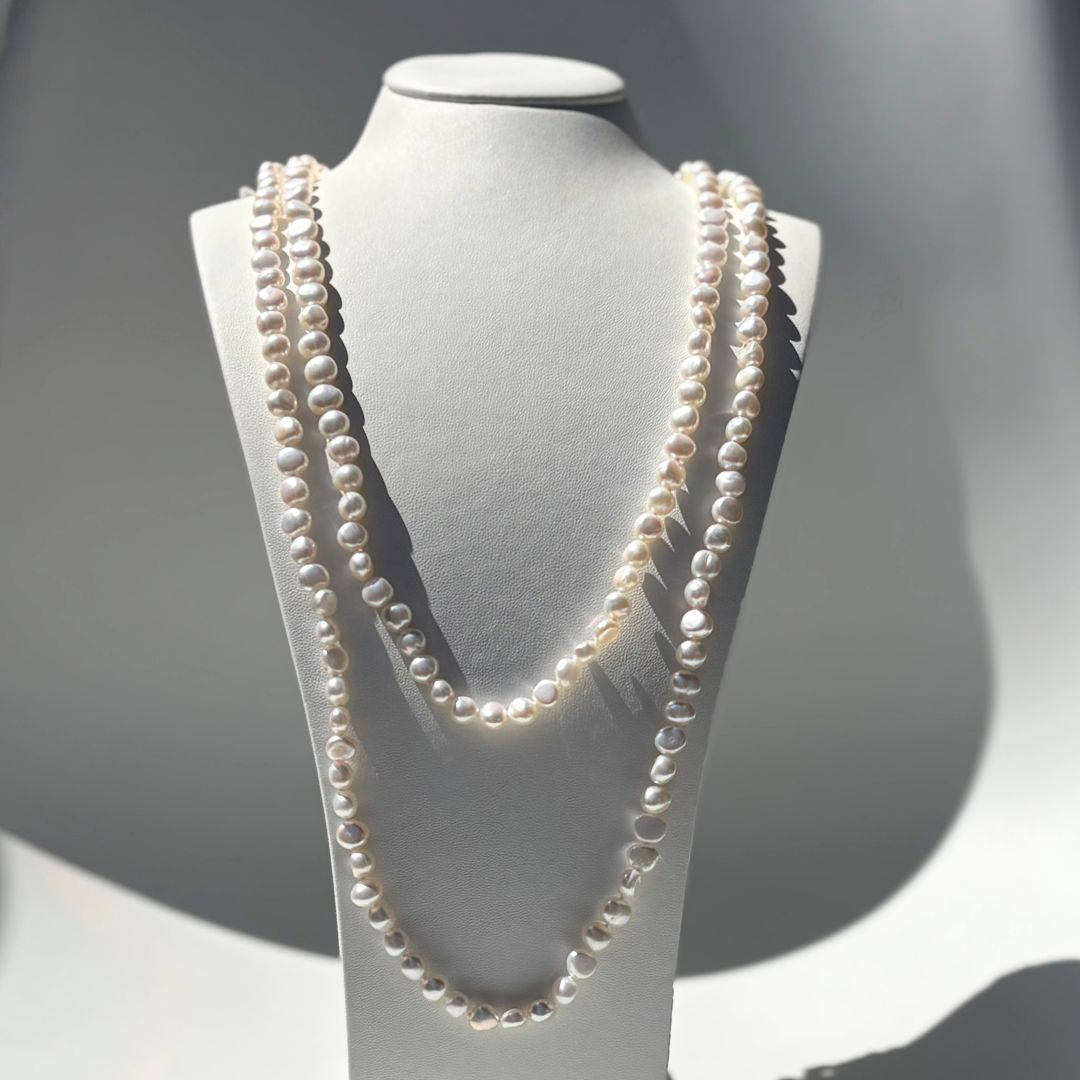 Each strand in this range is inherently unique due to the use of baroque pearls, which boast a variety of shapes. Our Georgiana Necklace stands out as the perfect accessory, showcasing individuality and understated elegance. Its extended length enhances its versatility, allowing it to complement any outfit for any occasion.