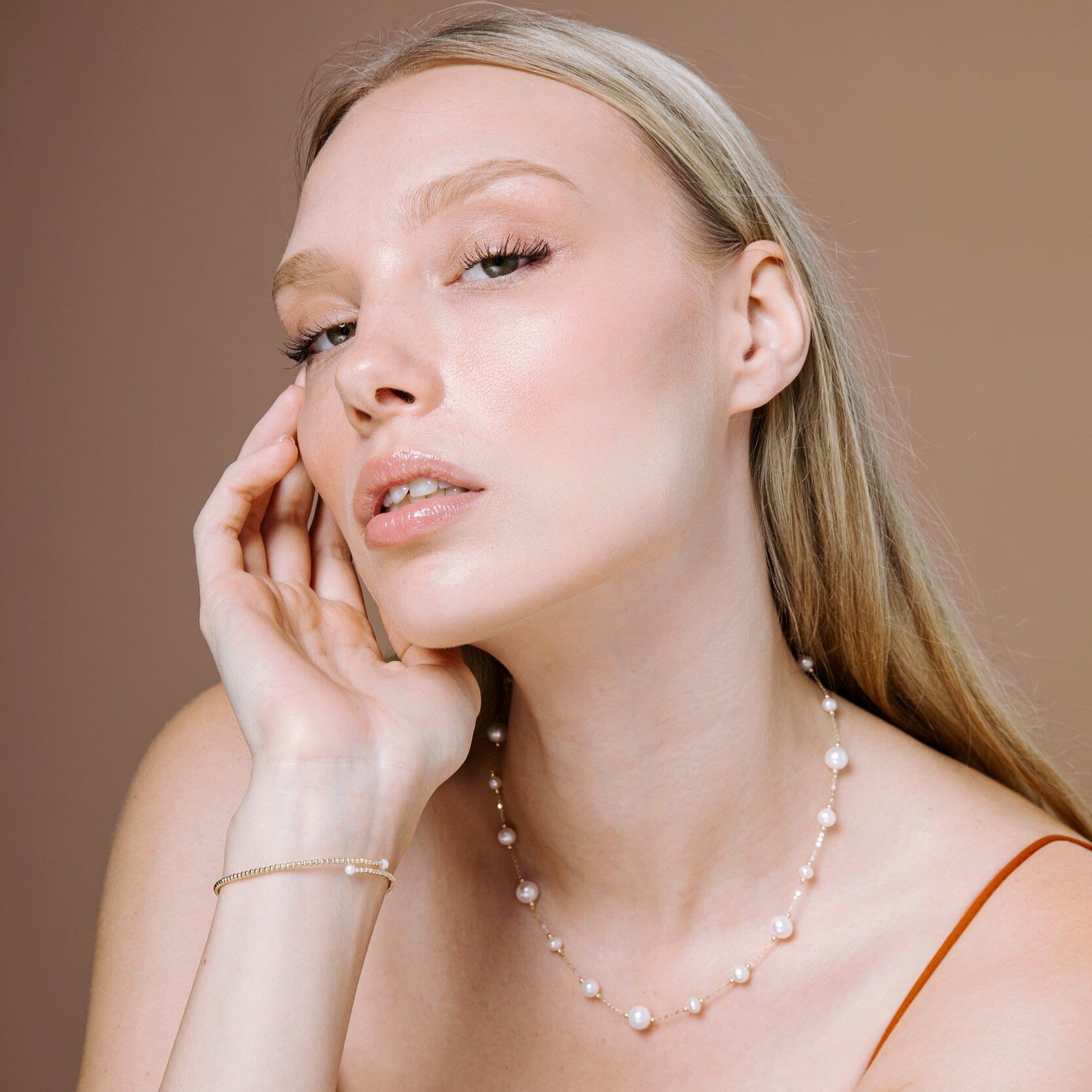 This exquisite necklace, crafted from 14ct yellow gold chain, exudes elegance as it displays a beautiful arrangement of lustrous white freshwater pearls and gold beads that gracefully embellish its entire length, resulting in a timeless and opulent accessory.