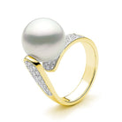 Radiate unparalleled elegance with this exquisite pearl and diamond ring. This luxurious piece of jewellery is meticulously handcrafted from luminous 9K gold, offering the perfect stage for the shimmering gemstones that adorn it. At its heart stands a magnificent South Sea Cultured pearl, boasting an ivory hue that reflects sumptuous highlights under any light.
