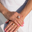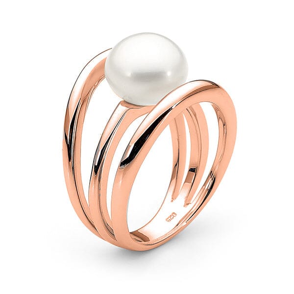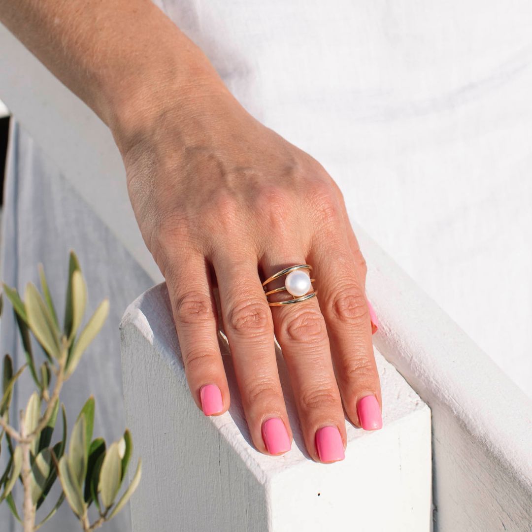 A modern take on timeless elegance, the Arabelle Ring is crafted in 9ct Gold and features a lustrous button-shaped Freshwater Pearl nestled between three sleek, parallel bands. The centre band gently dips to cradle the pearl, creating a refined yet distinctive silhouette. Available in Yellow or Rose Gold, it’s a versatile piece that effortlessly elevates any look.