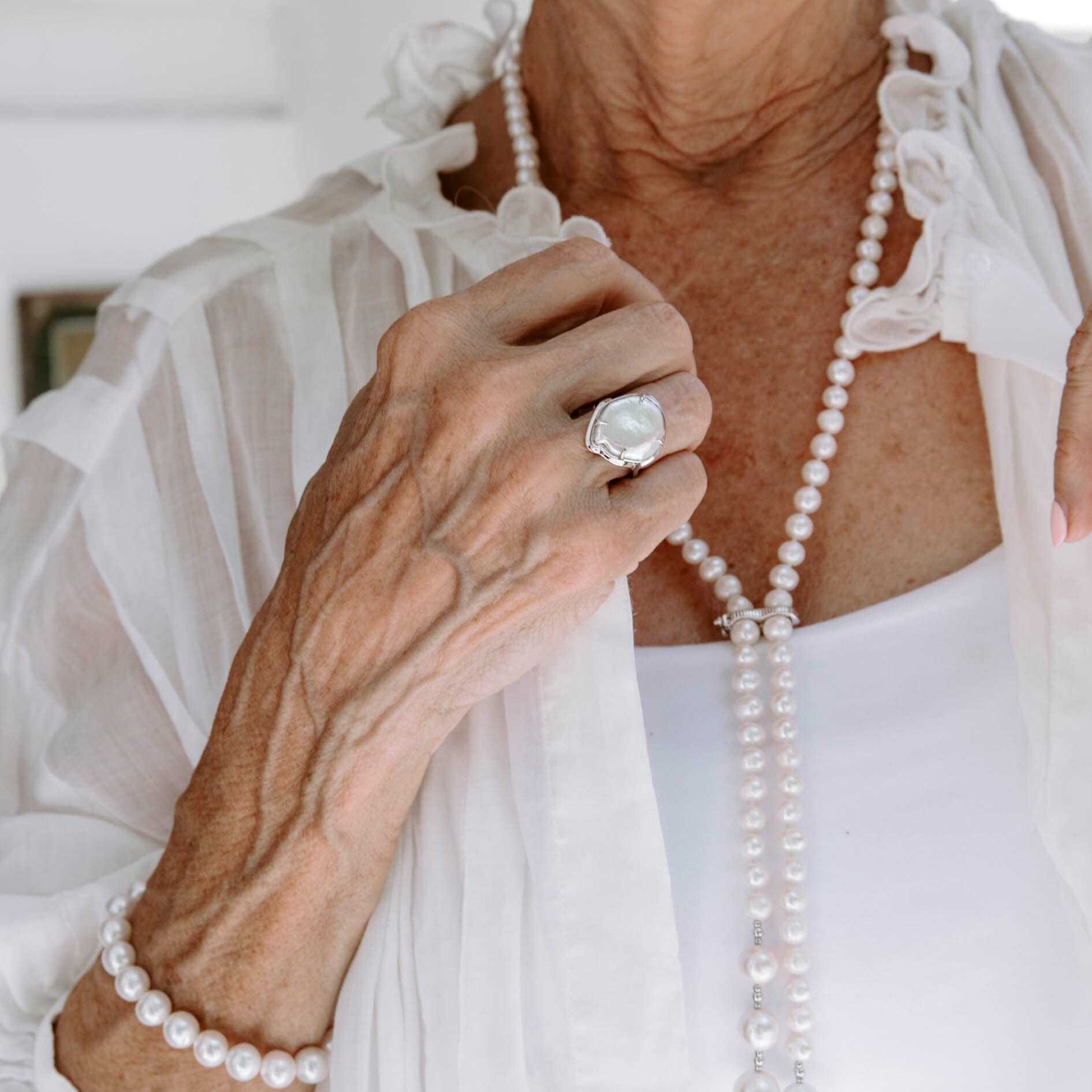 Celebrate the artistry of imperfection with this extraordinary hand-finished ring. The sterling silver band and the lustrous white Keshi freshwater pearl both bear the distinctive marks of meticulous craftsmanship, creating a one-of-a-kind piece. The irregularities in both the metal and the pearl contribute to the ring's unique charm, making it a timeless and elegant expression of natural beauty.