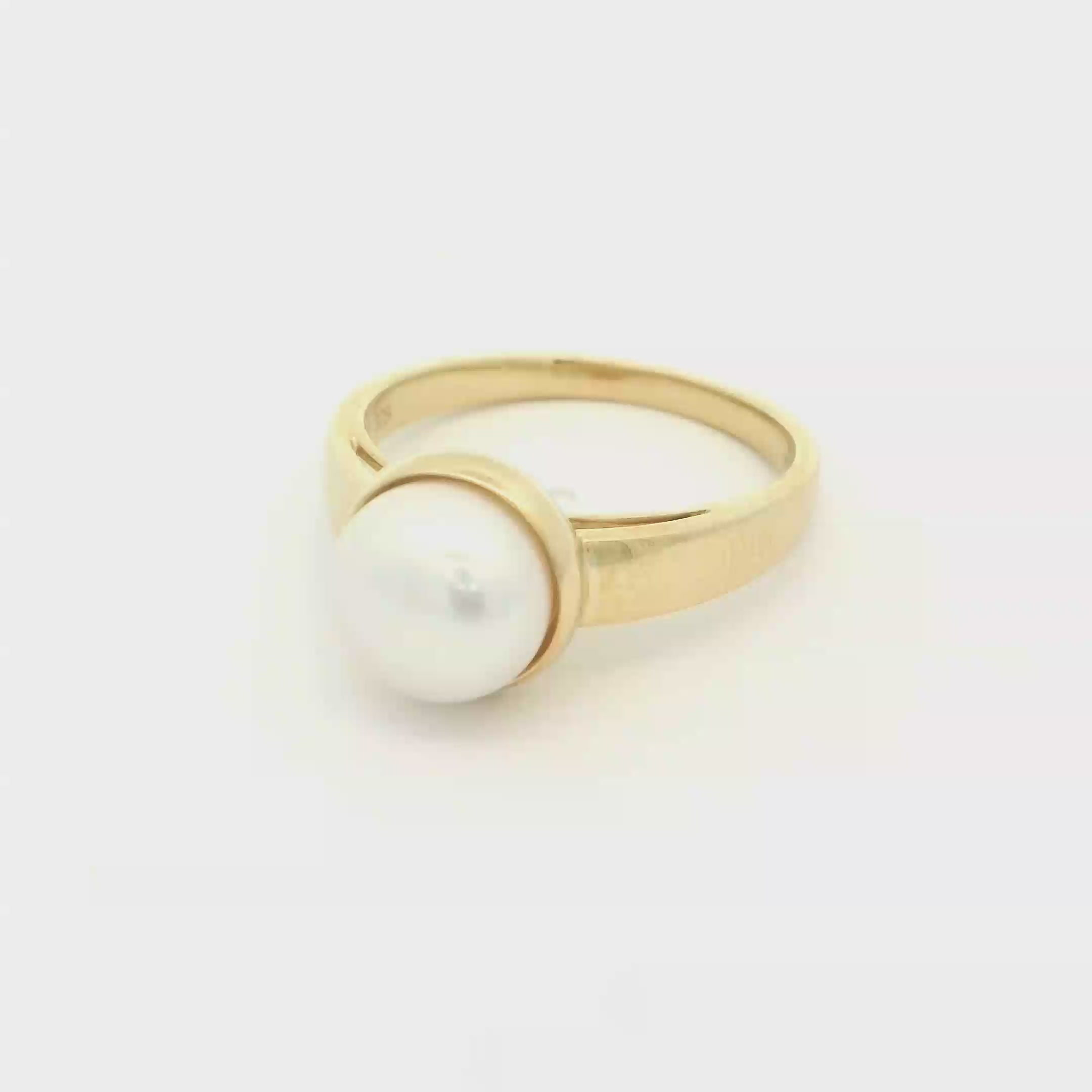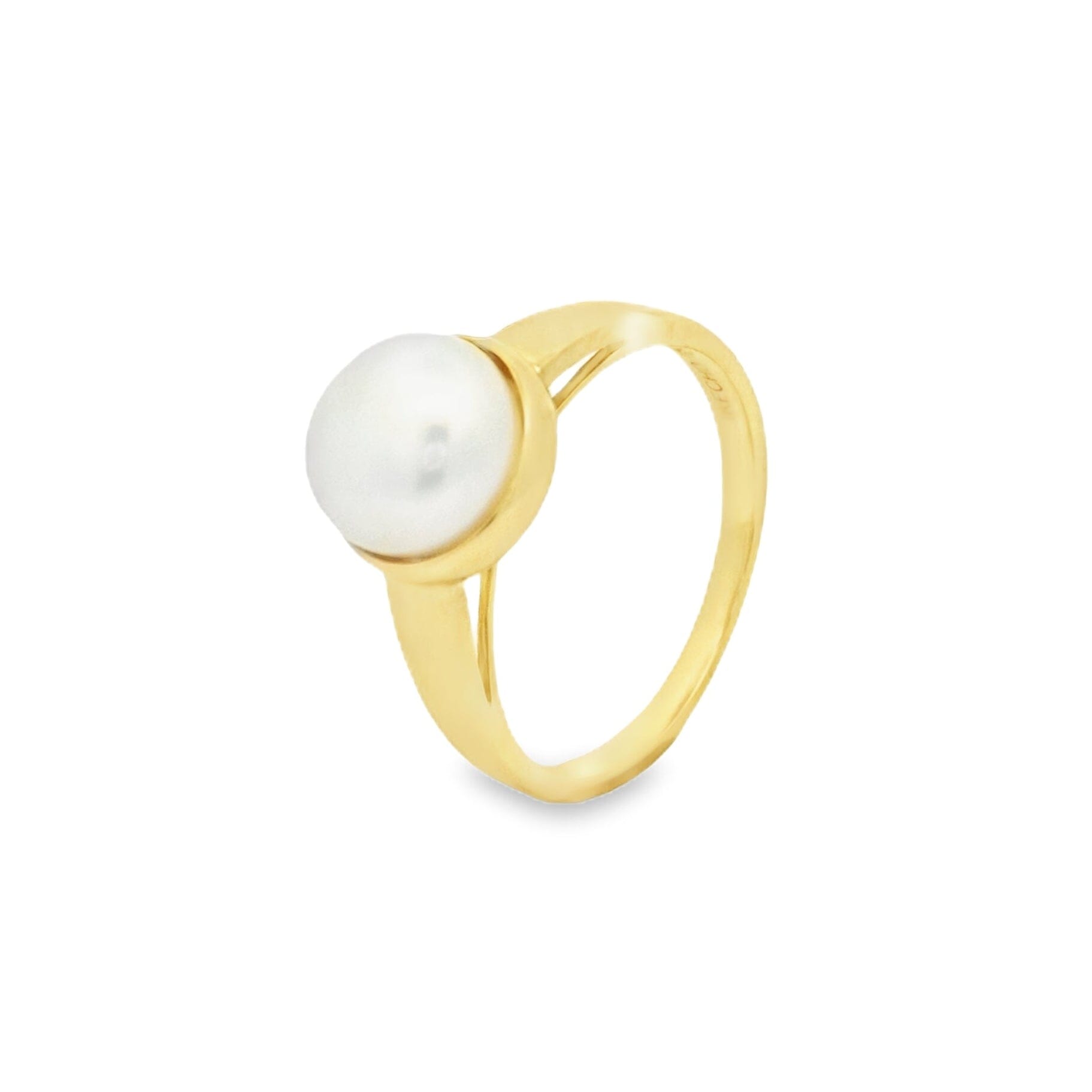 This elegant 9ct yellow gold ring features a timeless design accentuated by a pristine white button freshwater pearl set in a simple and classic arrangement, creating a sophisticated and enduring piece of jewellery.