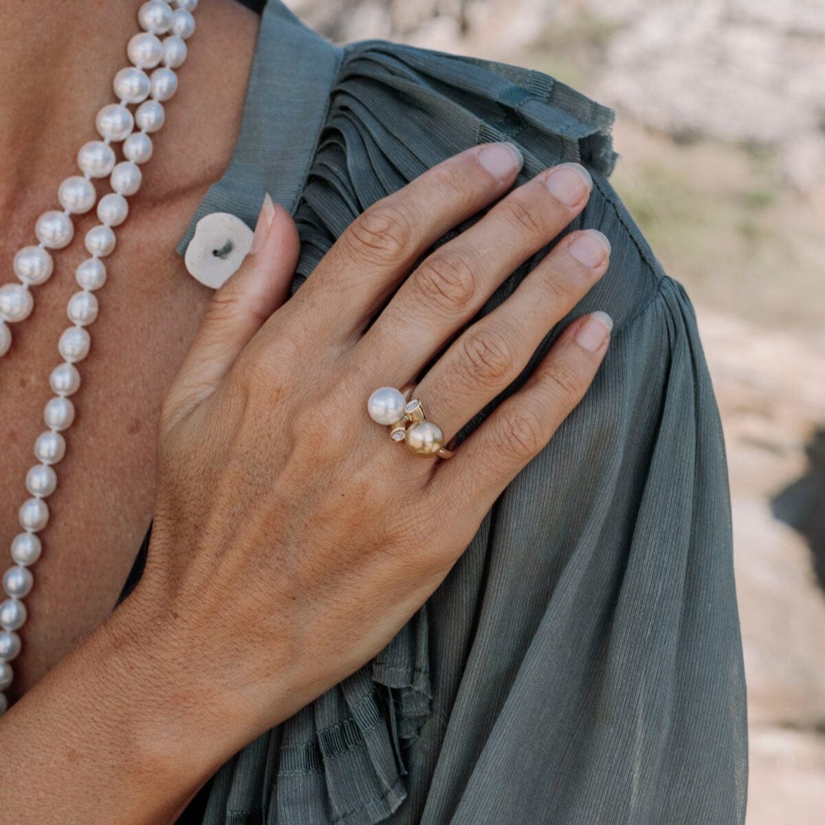 Discover the epitome of intertwined beauty with our exquisite double pearl diamond ring. The two South Sea pearls elegantly symbolize the boundless connection shared between two souls. Ideal for commemorating anniversaries, this ring boasts an extra touch of sophistication with a diamond stud accent, elevating its elegance to new heights.