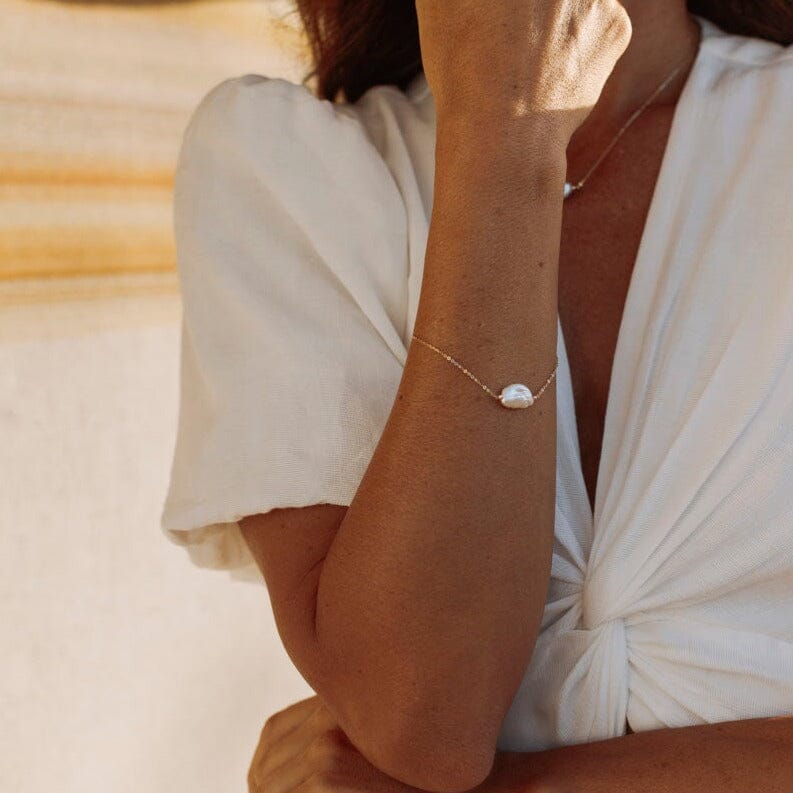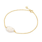 Introducing the Ida Bracelet, a fusion of understated elegance and modern sophistication. Our 14ct yellow gold chain seamlessly threads through the centre of a pristine white Keshi pearl, its irregular shape adding an intriguing touch to this minimalist yet sophisticated piece of jewellery.