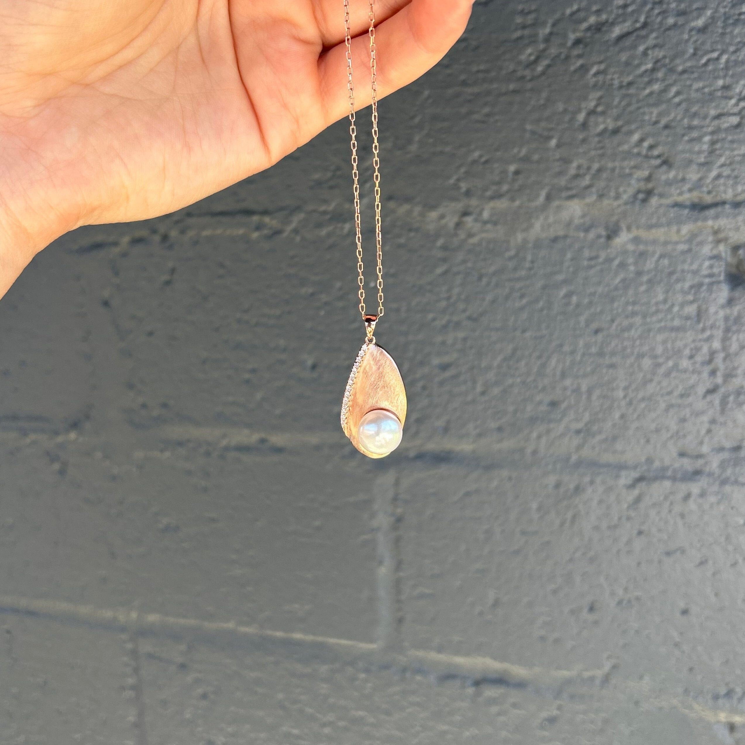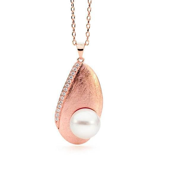 Exquisitely refined, this unique design is perfect for those who appreciate pearls with a modern twist. Featuring 14ct rose gold plating, the frosted finish highlights a flawless drop pearl, complemented by sparkling cubic zirconia accents along the edges. This stylish piece is an elegant choice for any occasion.
