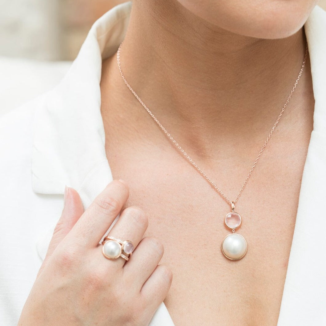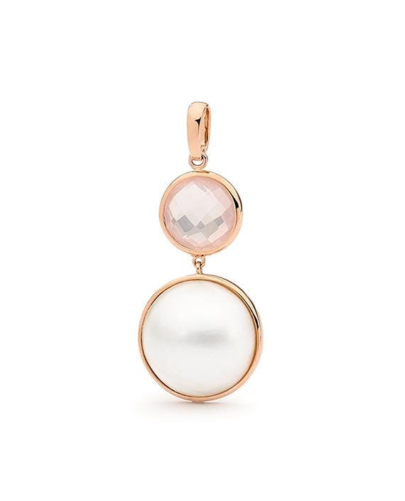 When it comes to opulent classics with a creamy, flawless edge, our white Mabe cultured pearl enhancer is must-have. This pendant, with the addition of a feminine rose quartz drop accent, is an extremely versatile piece that is perfect for every day wear or for a gift for a loved one. Matching earrings also available for a complete set.