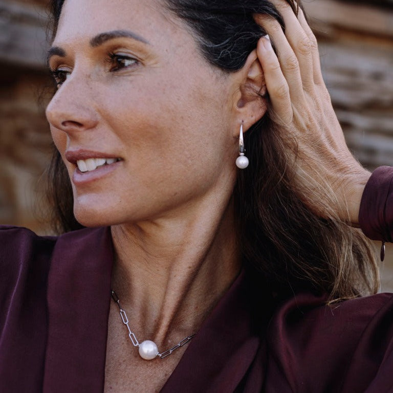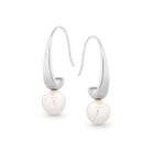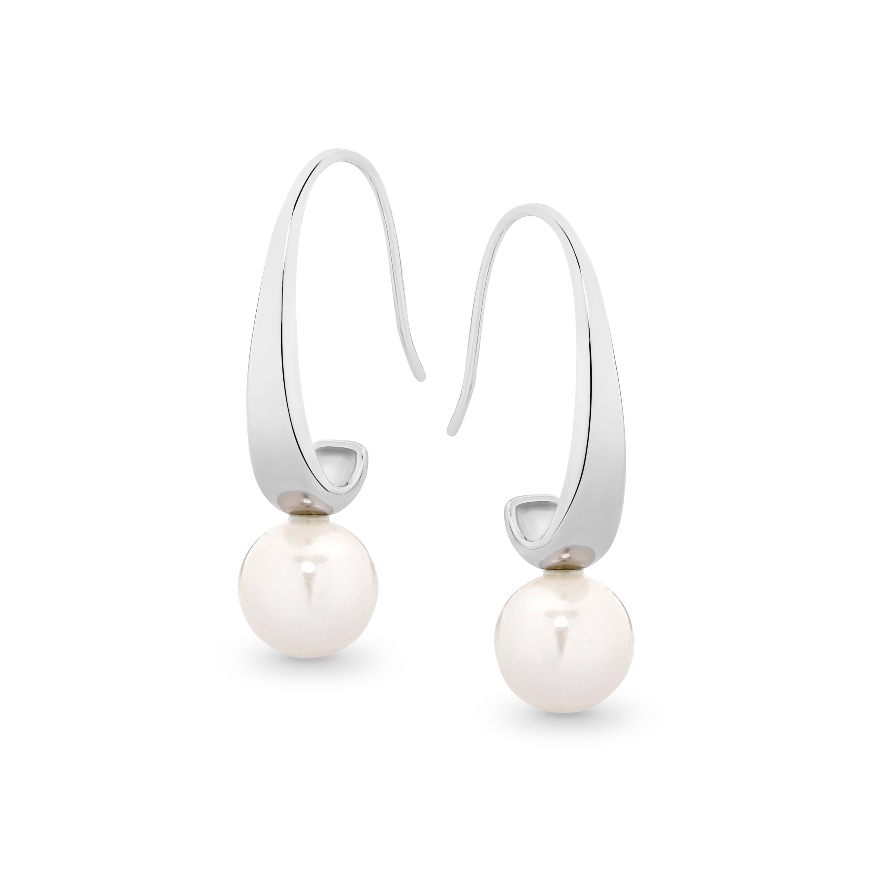 Upgrade your style with our sleek sterling silver long hook earrings, showcasing a contemporary design that effortlessly combines with a lustrous round freshwater pearl, offering a touch of modern sophistication to any ensemble.