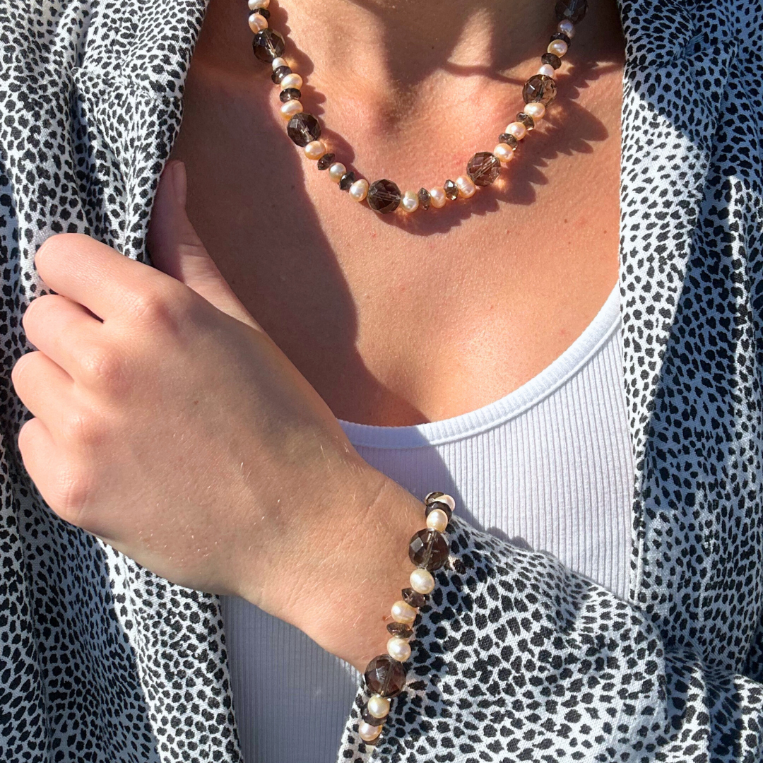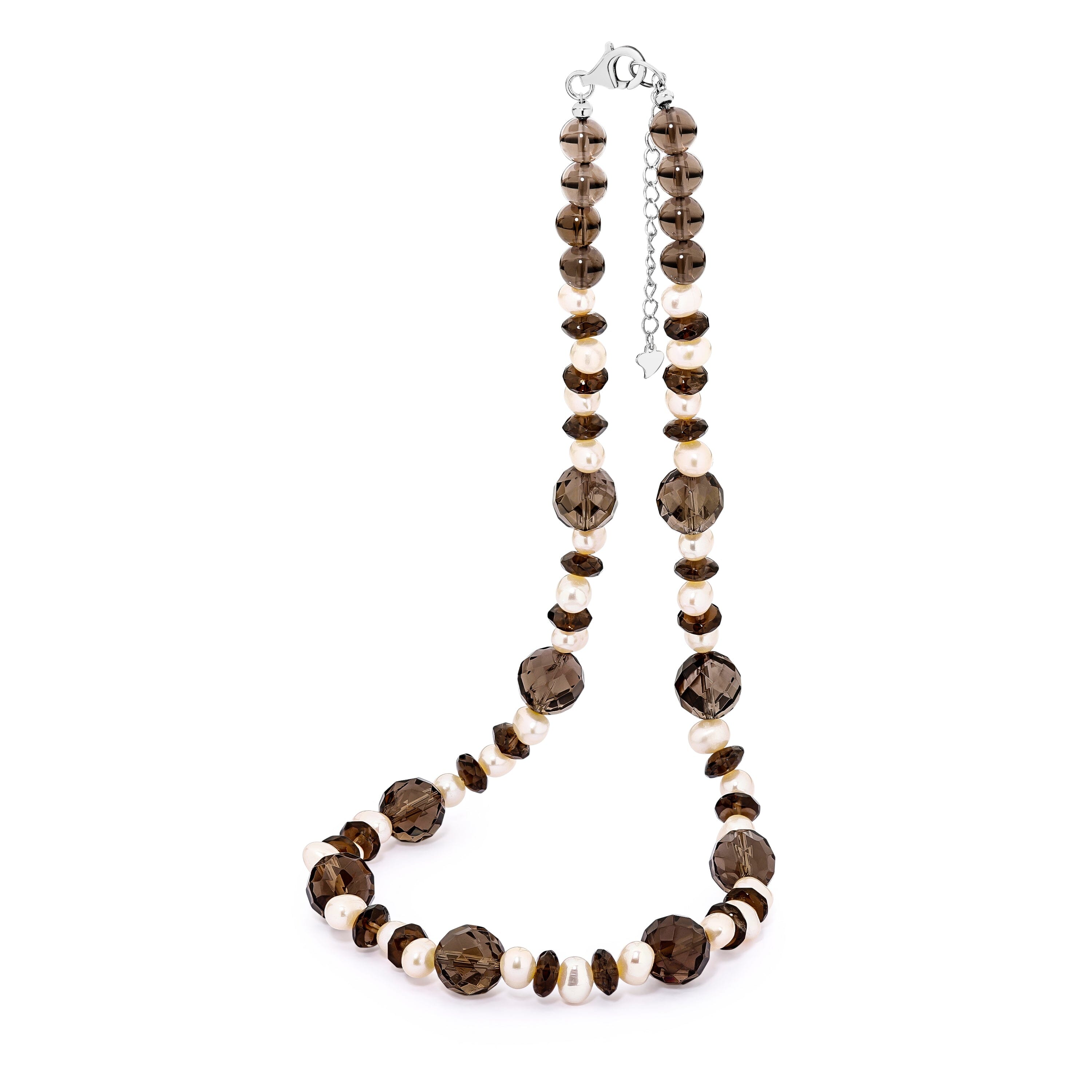 Elegance meets earthy allure in this stunning necklace, 'Wynter'. Alternating smoky quartz and lustrous white oval freshwater pearls exude sophistication, complemented by a sterling silver clasp with an extension for a perfect fit. Elevate your style with its versatile charm, whether for a casual outing or a formal affair.
