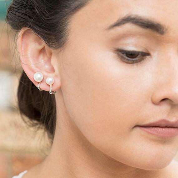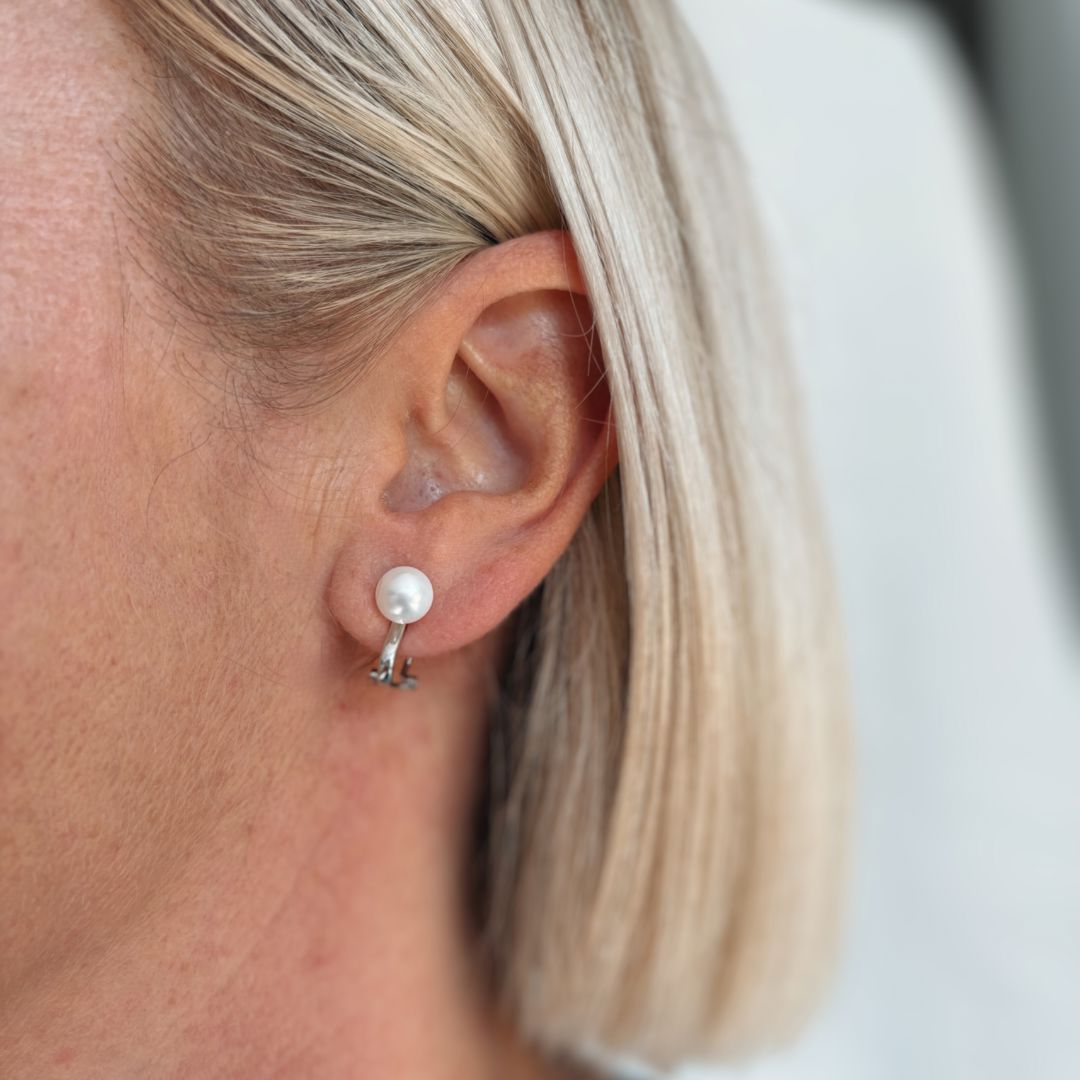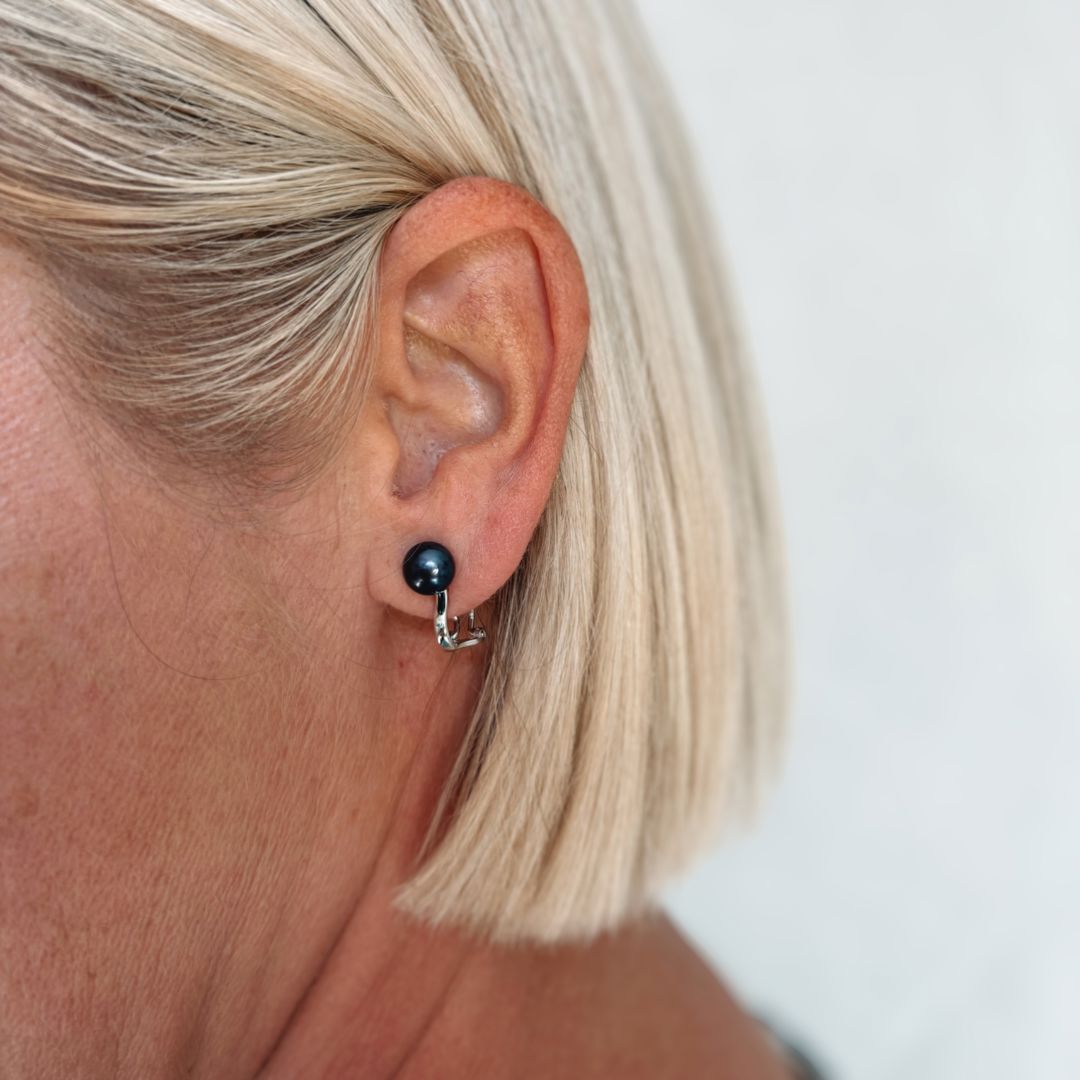 The Aria Clip-ons are sterling silver clip-on earrings featuring elegant freshwater button pearls, available in your choice of natural white or dyed black. Perfect for those without piercings or anyone seeking a versatile option, they offer a timeless design with all-day comfort—an ideal accessory for any outfit or occasion.