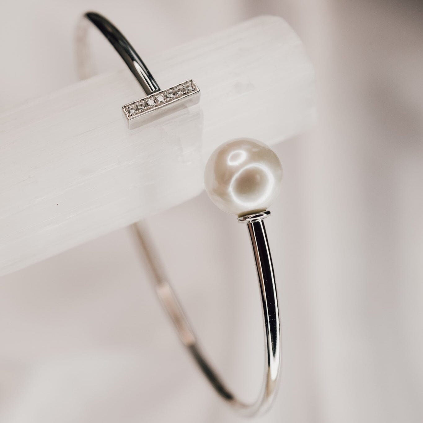 The Shooting Star Bangle is sure to enhance your collection. With its open design, this bar style bangle showcases a captivating freshwater cultured pearl and dazzling cubic zirconia stones, making it a distinctive and attention-grabbing addition.