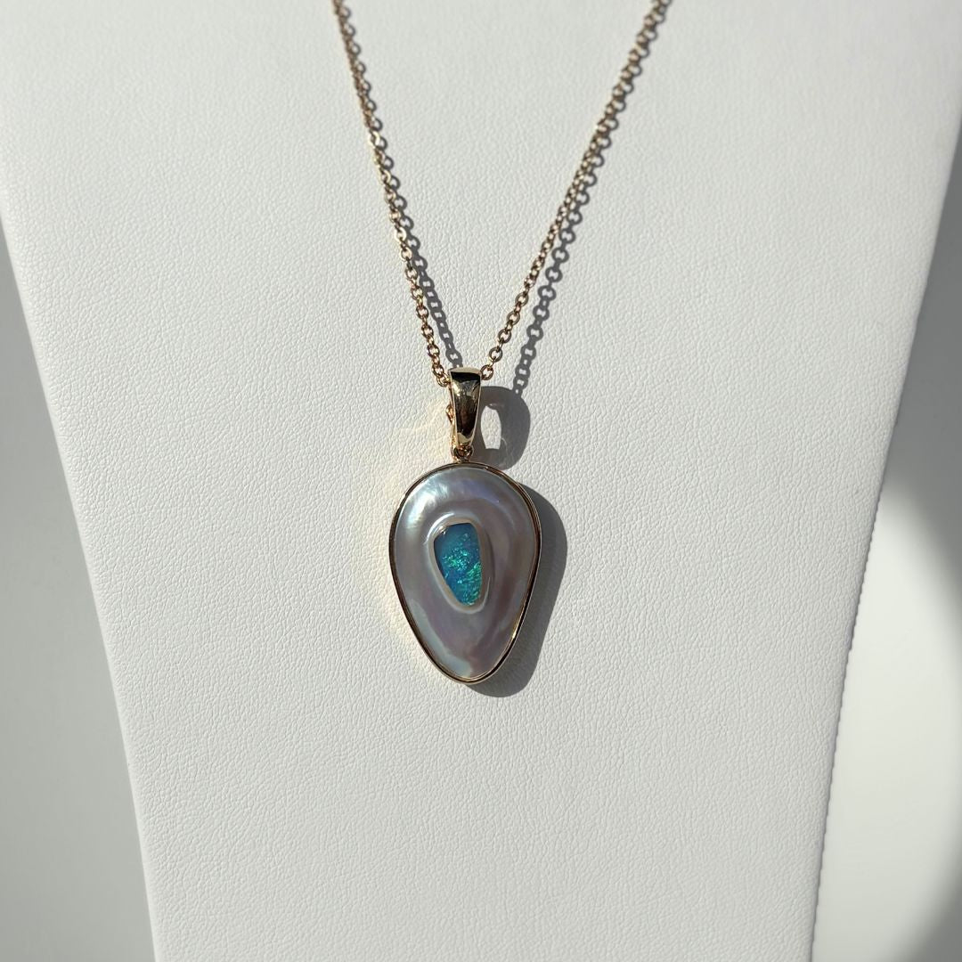 Discover this stunning piece from the Earth+Ocean Jewellery collection, featuring a unique Solid Opal and South Sea Mabe Pearl. Each piece showcases a natural fusion of opal encased in nacre layers by a Batwing Oyster, creating a one-of-a-kind treasure. This collection captures the essence of natural beauty, offering exclusive jewellery that seamlessly blends oceanic and earthy elements through a remarkable natural process.
