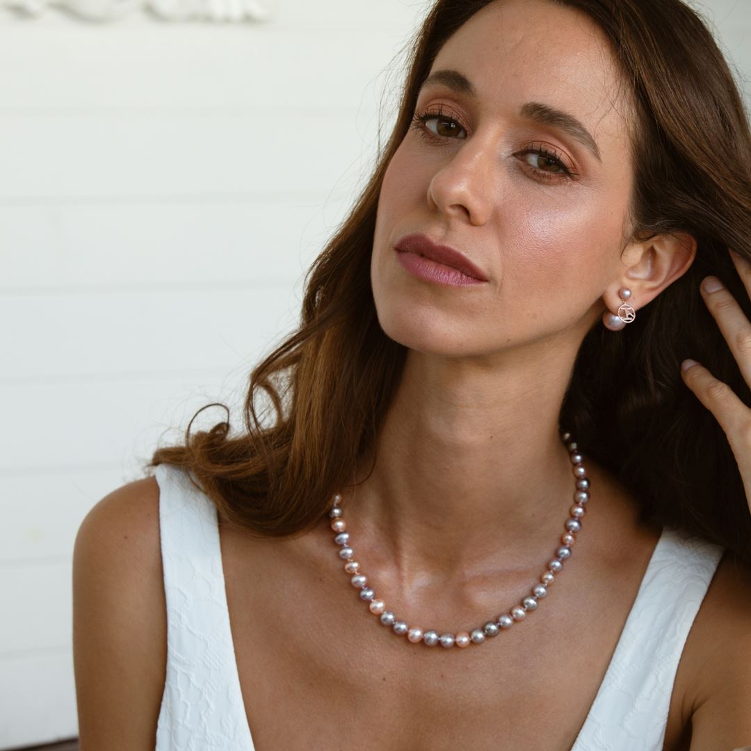The Champagne Bubbles Necklace features a stunning freshwater round pearl strand necklace with alternating natural pink pearls in varying hues, all elegantly fastened by a 9ct rose gold spherical clasp, creating a timeless and sophisticated jewellery piece.