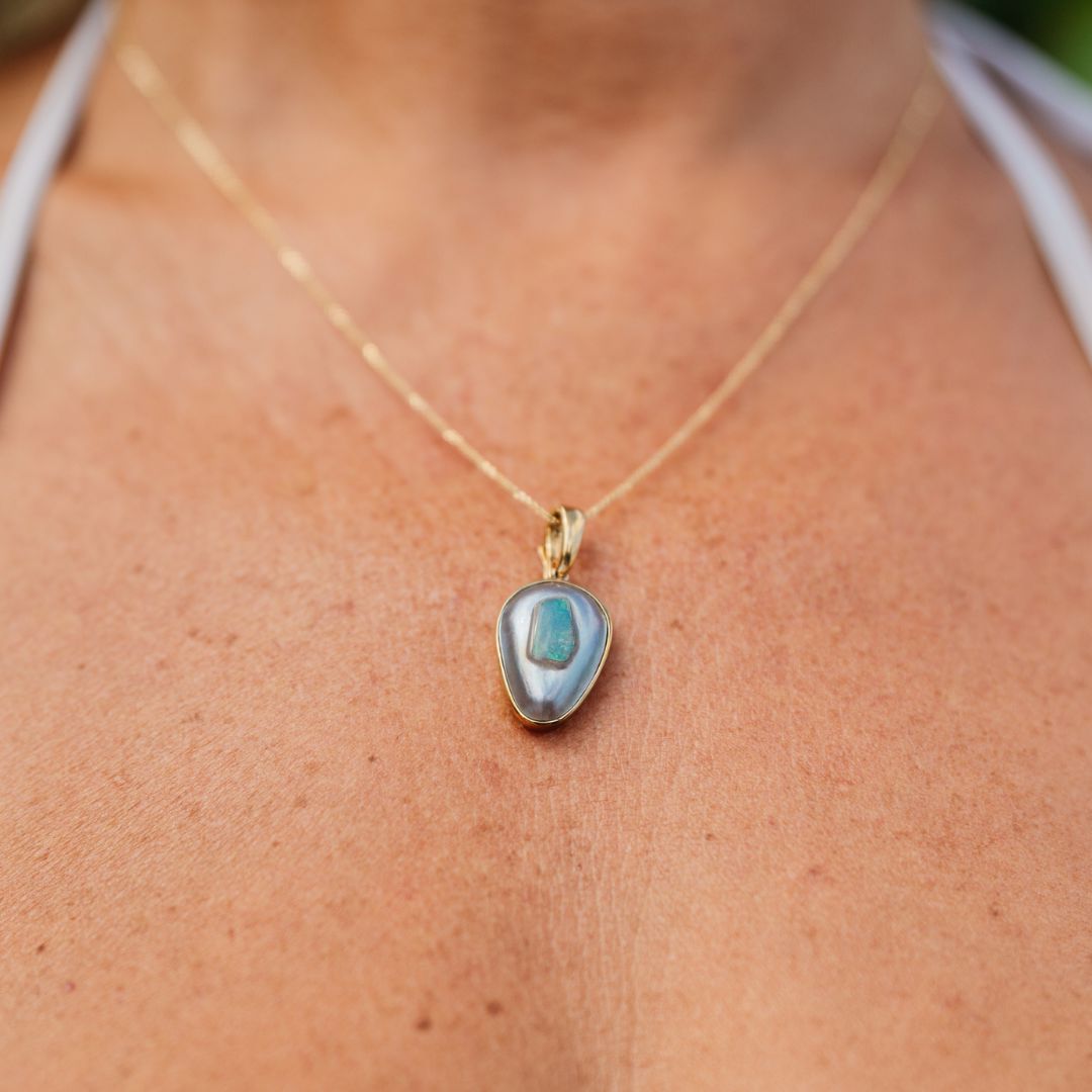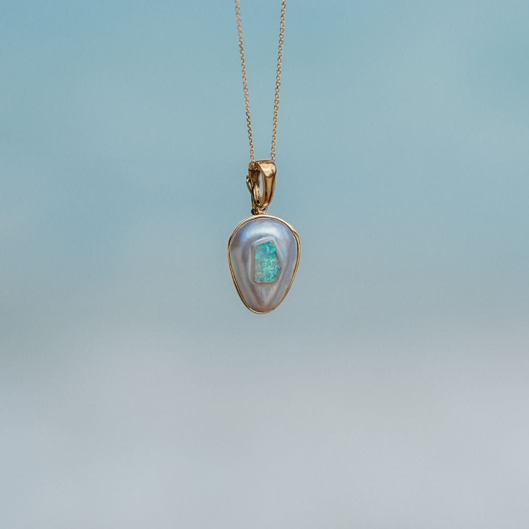 Discover this stunning piece from the Earth+Ocean Jewellery collection, featuring a unique Solid Opal and South Sea Mabe Pearl. Each piece showcases a natural fusion of opal encased in nacre layers by a Batwing Oyster, creating a one-of-a-kind treasure. This collection captures the essence of natural beauty, offering exclusive jewellery that seamlessly blends oceanic and earthy elements through a remarkable natural process.