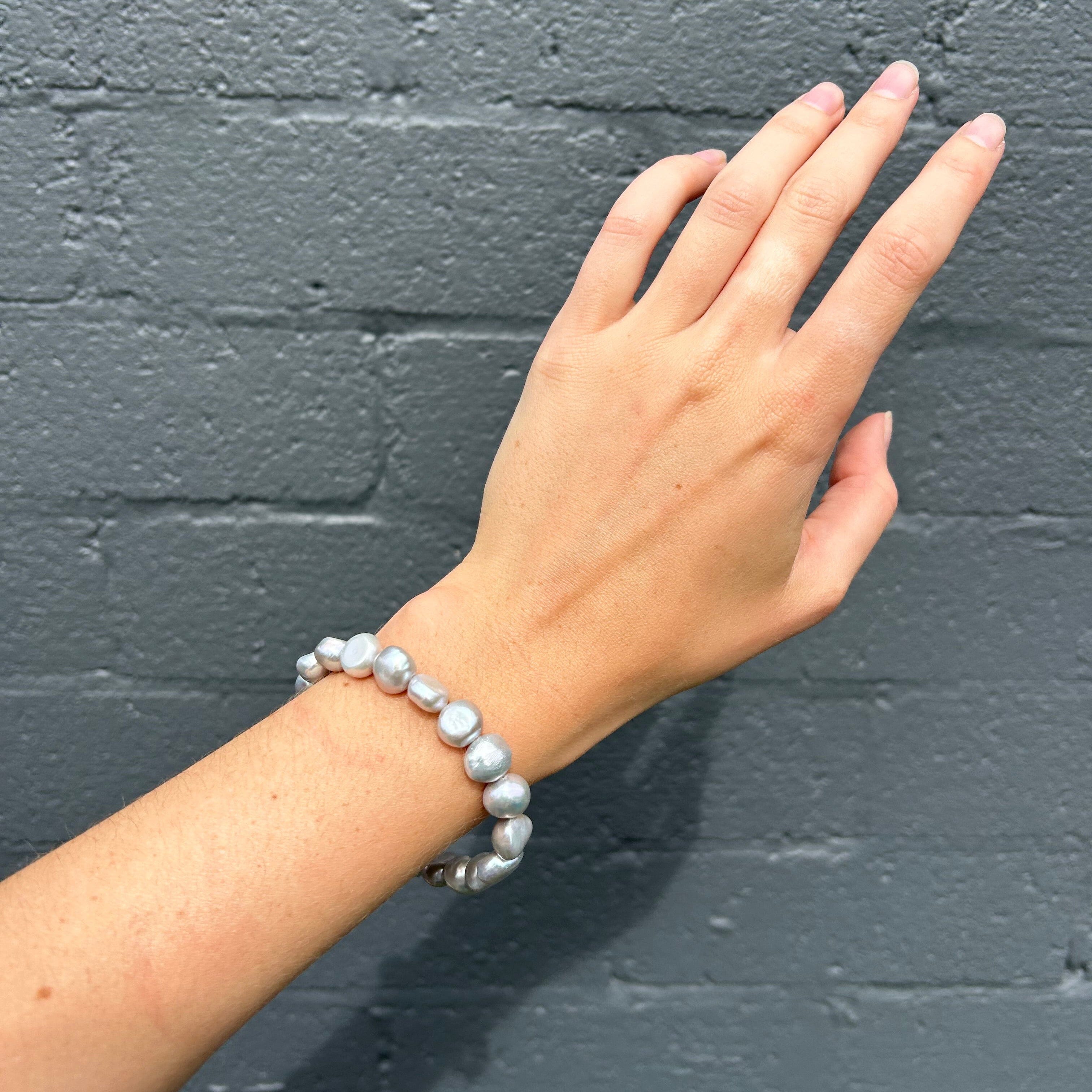 The Audrey Bracelet features organically shaped Keshi freshwater pearls, effortlessly combining versatility and elegance. The Audrey Bracelet can be worn as a standalone piece for a subtle touch of sophistication or layered to create a more dynamic look.