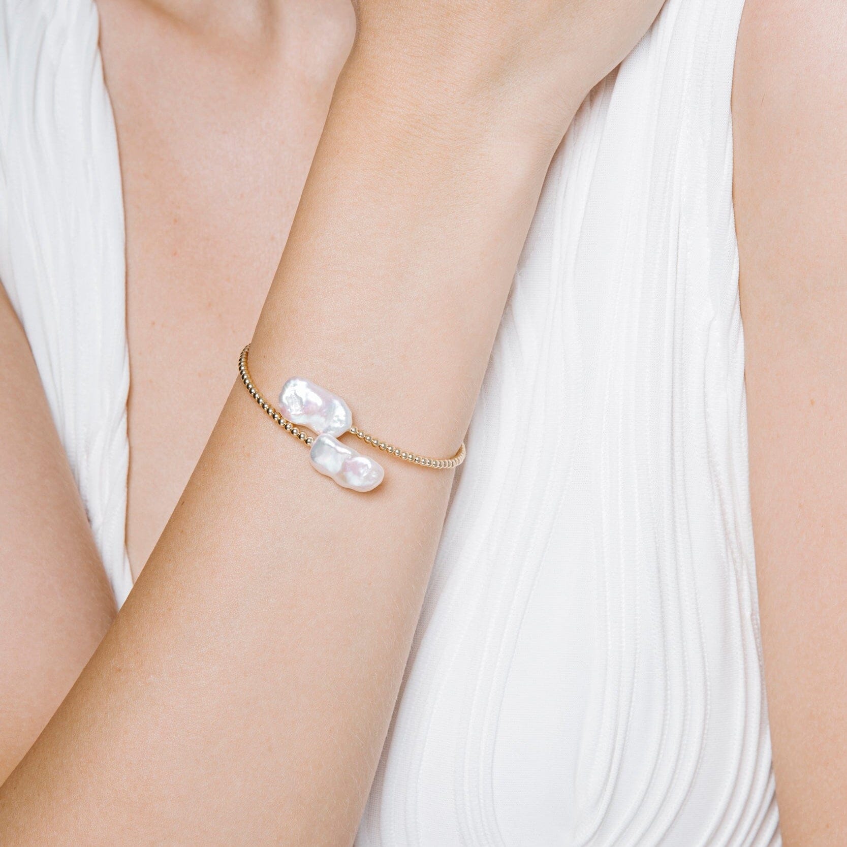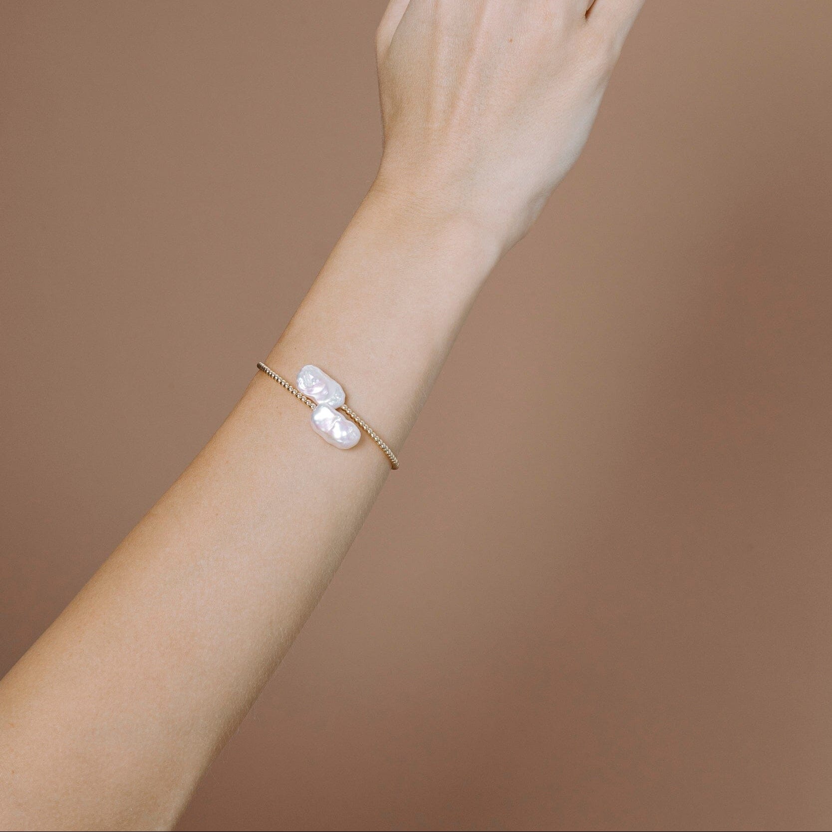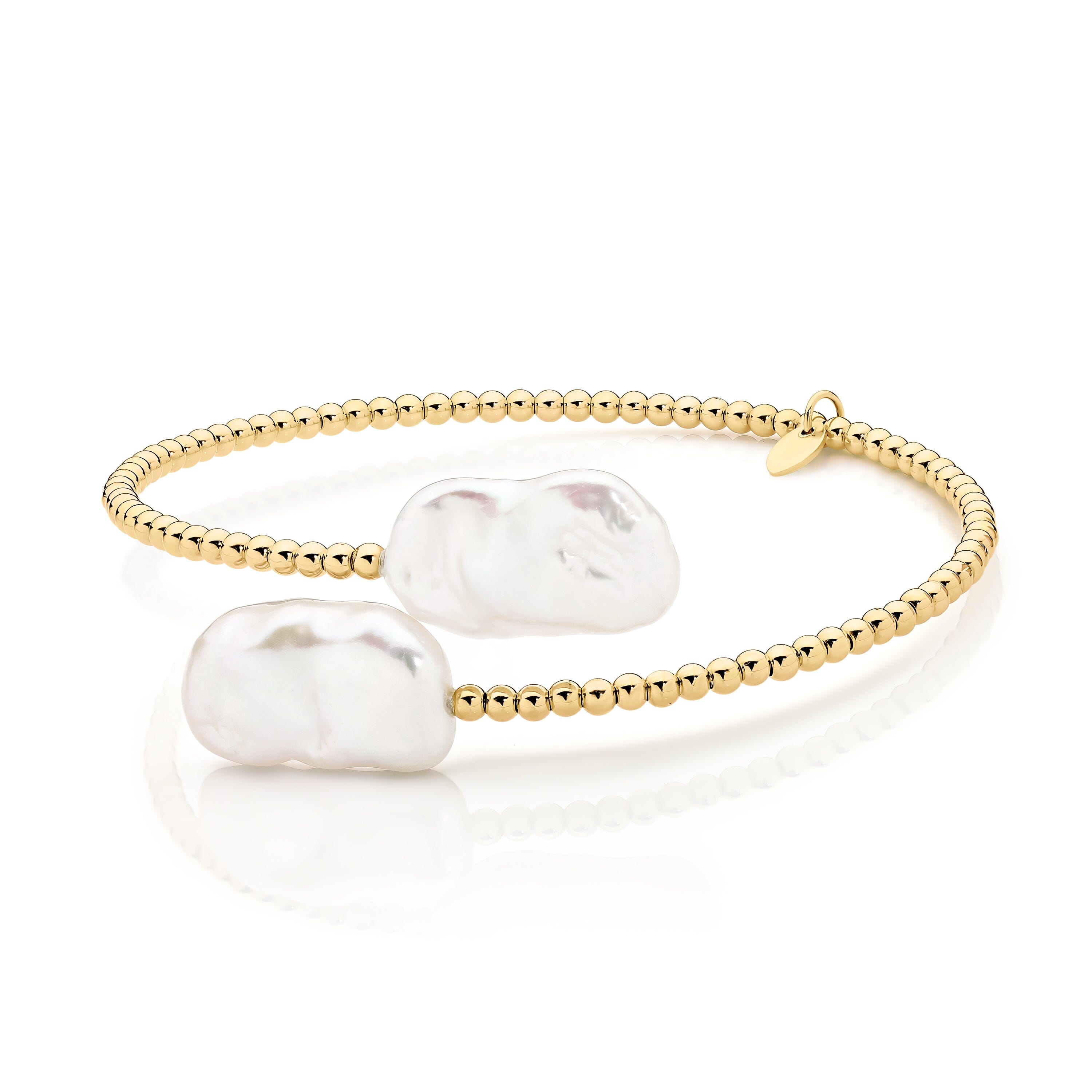 The Harper Bracelet is designed to make an effortless statement. Featuring two luminous baroque pearls set on a strand of polished 14ct yellow gold beads, each bracelet is beautifully unique. The Harper Bracelet embodies the balance between organic elegance and modern minimalism, making it perfect for layering or wearing on its own as a refined focal piece.