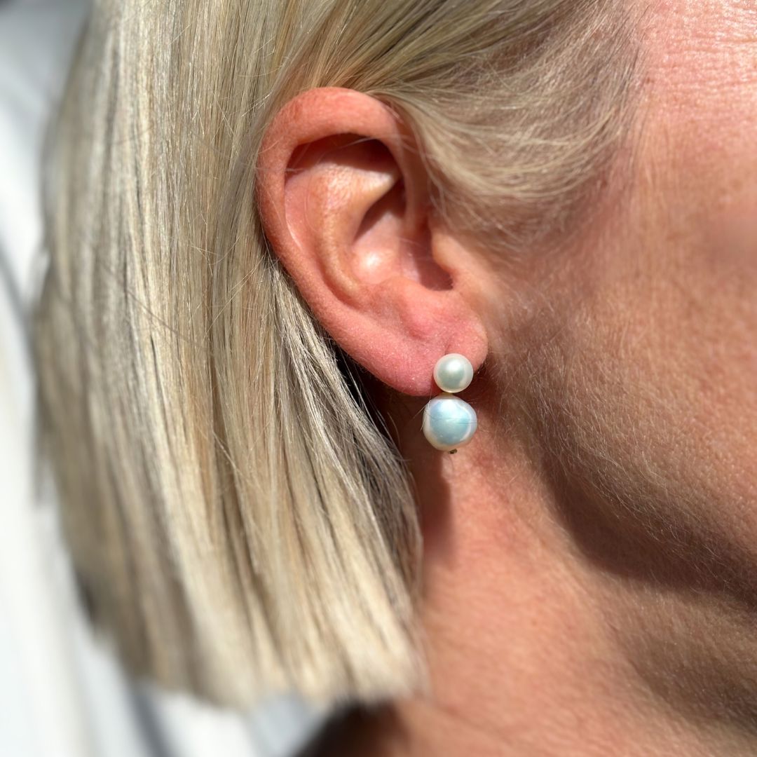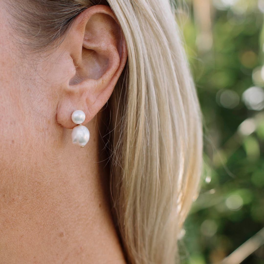The Maxine Earrings offer a blend of sophistication and grace. Featuring yellow gold studs, these earrings showcase a pristine white freshwater button pearl at the top, elegantly perched on the earlobe. Below, a striking white baroque pearl suspends gracefully, adding a touch of fluidity and allure. The combination of classic yellow gold with lustrous pearls creates a timeless and refined accessory, perfect for elevating both everyday and special occasion outfits.