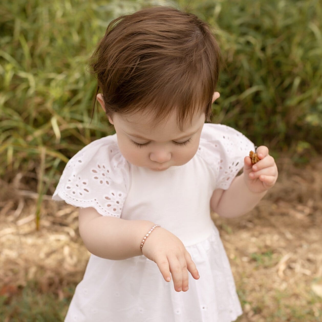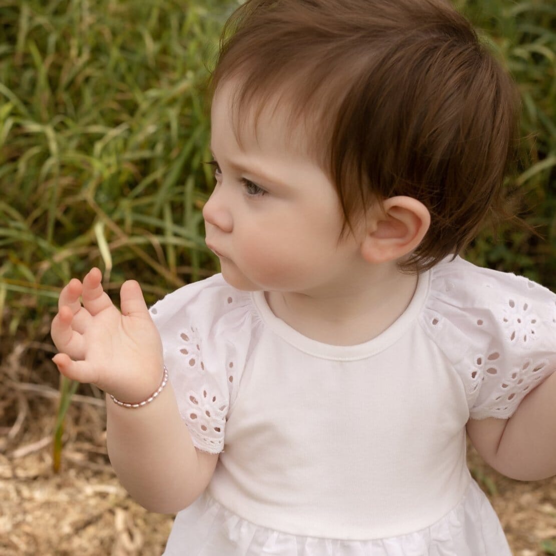 The Poppy Bracelet, part of our Bambini Collection, is perfectly sized for babies up to 12 months, adding a touch of classic elegance for little ones. Crafted with delicate oval freshwater pearls in natural white or natural pink, this bracelet is designed for both comfort and style with a gentle elastic fit. A beautiful keepsake and thoughtful gift for welcoming a new arrival.